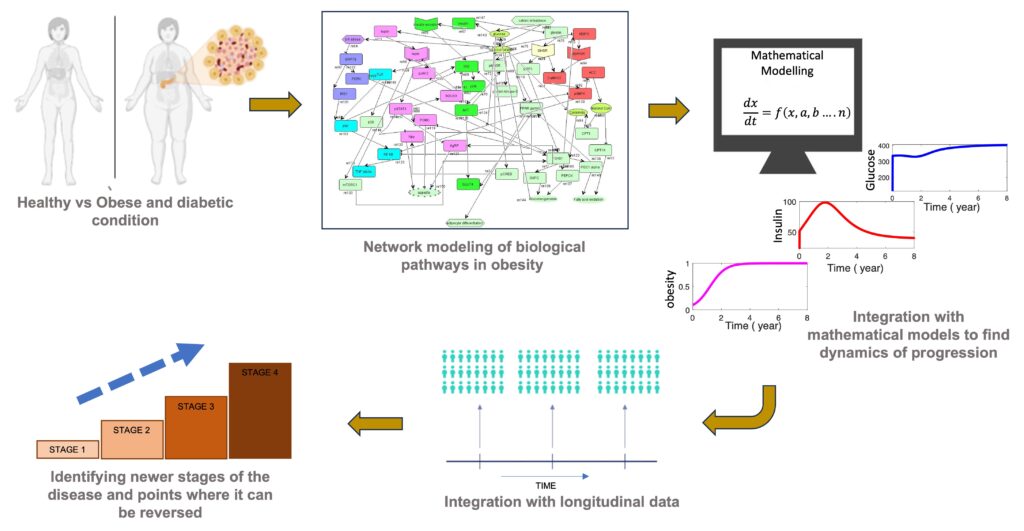This research will construct Boolean network models of obesity and T2DM biological pathways to identify key molecular interactions driving disease progression. Integrating these Boolean networks with ordinary differential equation models and longitudinal data will provide insights into disease dynamics and multi-factor interactions, surpassing the limitations of experimental data alone. Future research will focus on staging disease progression and identifying points of no return.