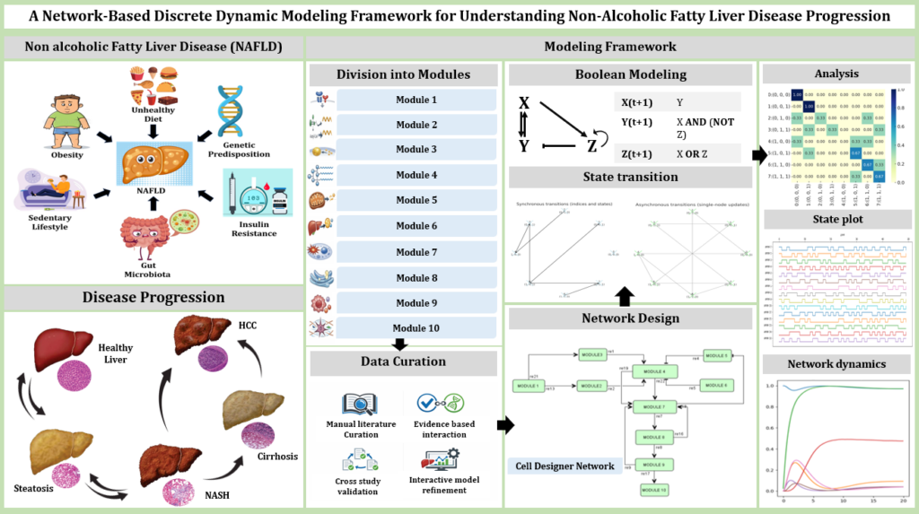 The aim of this project is to develop a Boolean model of Non-Alcoholic Fatty Liver Disease (NAFLD) that captures the key molecular and metabolic interactions driving disease progression. A Boolean model of NAFLD simplifies the complex metabolic and signaling networks into logical interactions, making the disease mechanisms easier to study. It helps identify key regulatory nodes driving progression from steatosis to NASH and fibrosis. Such models can predict outcomes of interventions and guide therapeutic strategies where experimental data are limited. This model will help in understanding critical regulatory nodes, simulating disease dynamics, and exploring potential therapeutic targets.