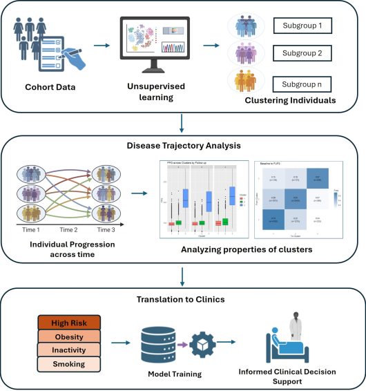 High-risk factors for diabetes can be identified through advanced machine learning techniques, particularly clustering algorithms applied to longitudinal cohort data. This method groups individuals based on similar health characteristics, facilitating the identification of phenotypes associated with increased diabetes risk. Based on the extracted features and parameters, a mathematical model can be used to analyze diabetes progression and the interactions of risk factors over time. The resulting insights can guide healthcare providers in making informed, data-driven decisions and developing personalized treatment plans.